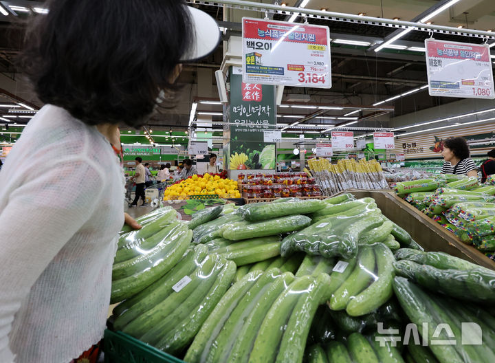 [서울=뉴시스] 이영환 기자 = 여름철 밥상에 자주 오르는 채소류 가격이 급등하고 있는 10일 서울 서초구 농협유통 하나로마트 양재점에서 한 시민이 오이 판매가격을 살펴보고 있다.