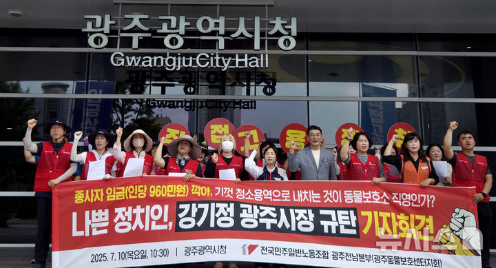 [광주=뉴시스] 류형근 기자 = 10일 오전 광주 서구 광주시청 앞에서 전국민주일반노동조합 광주동물보호센터지회가 "광주시 직영전환 이후 급여가 80만원 이상 삭감됐다"며 직접고용 촉구 기자회견을 하고 있다. 2025.07.10. [email protected]