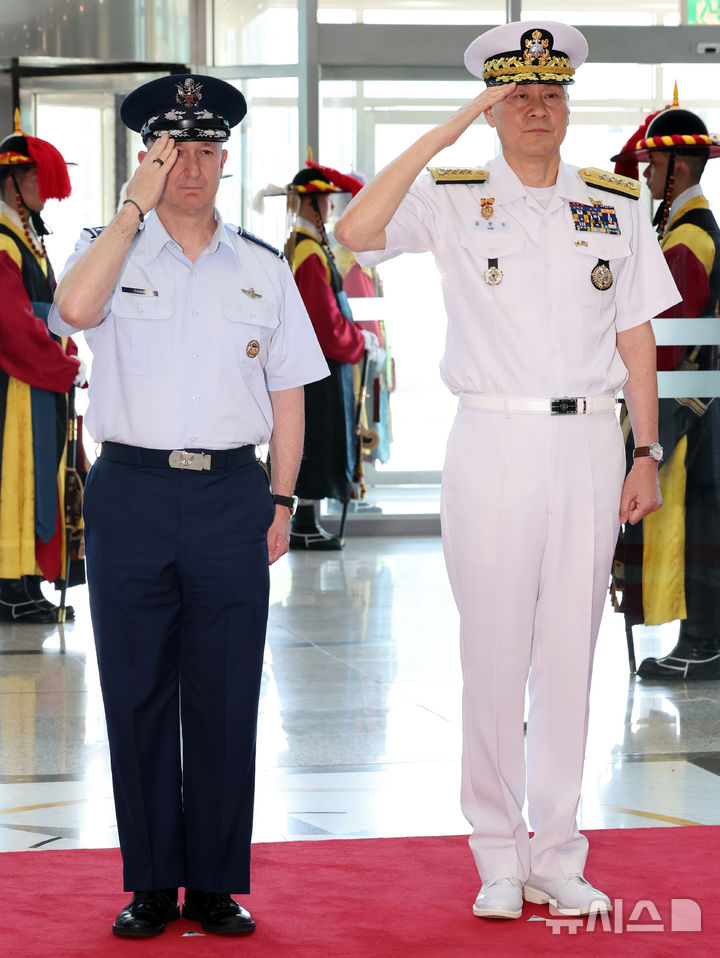 [서울=뉴시스] 김선웅 기자 = 김명수 합참의장과 존 다니엘 케인 미국 합참의장(공군 대장)이 10일 서울 용산구 국방부에서 열린 의장행사에서 거수경례를 하고 있다. (공동취재) 2025.07.10. [email protected]