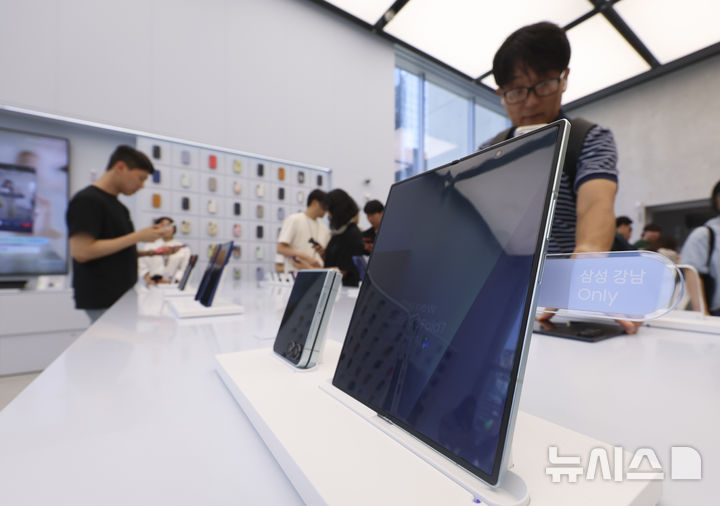 [서울=뉴시스] 김근수 기자 = 삼성전자 신형 폴더블 스마트폰 갤럭시 Z 폴드7 및 플립7 공개 첫 날인 10일 서울 서초구 삼성 강남점에 갤럭시Z 폴드7 제품이 전시돼 있다. 2025.07.10. [email protected]