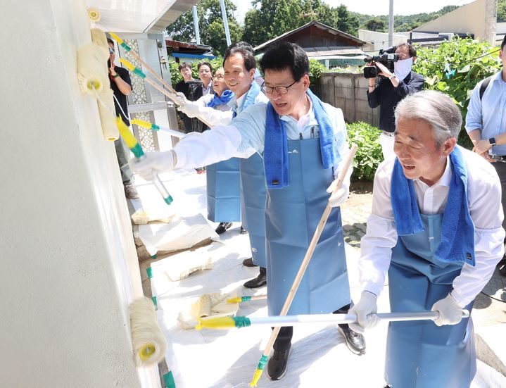 [서울=뉴시스] 강호동(오른쪽부터) 농협중앙회장과 임호선 더불어민주당 의원, 조병옥 음성군수 및 봉사자들이 10일 충북 음성군 금왕읍 내송리 비성마을에서 열린 사랑의 집고치기 농가희망 봉사활동에서 담장 도색 작업을 하고 있다. (사진=농협중앙회 제공) 2025.07.10. [email protected] *재판매 및 DB 금지