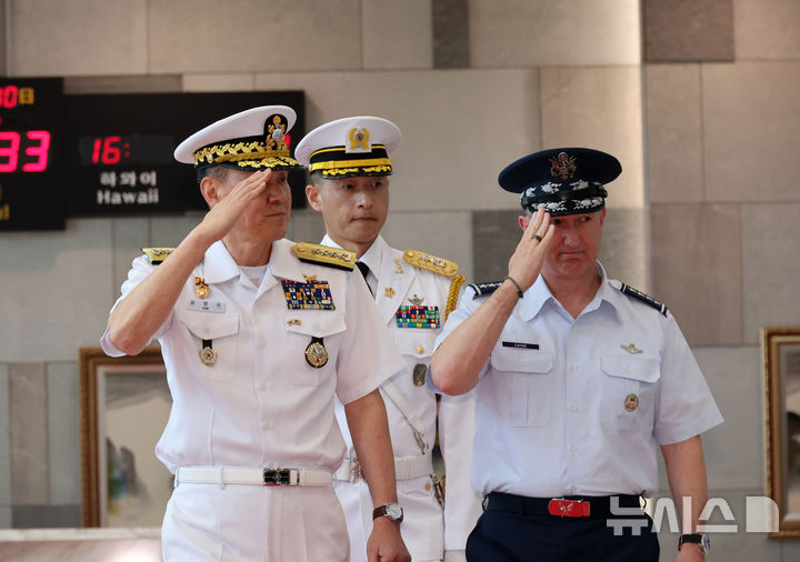 [서울=뉴시스] 김선웅 기자 = 김명수 합참의장과 존 다니엘 케인 미국 합참의장(공군 대장)이 10일 서울 용산구 국방부에서 열린 의장행사에서 거수경례를 하고 있다. (공동취재) 2025.07.10. [email protected]