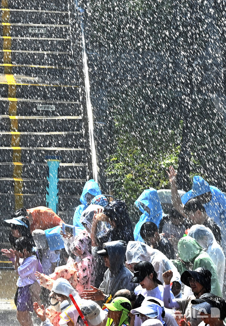 [용인=뉴시스] 김종택 기자 = 전국 대부분 지역에 폭염특보가 발효된 10일 경기 용인시 에버랜드 카니발 광장을 찾은 시민들이 여름축제 '슈팅 워터펀 시즌2'에서 물줄기를 맞으며 더위를 식히고 있다. 2025.07.10. [email protected]