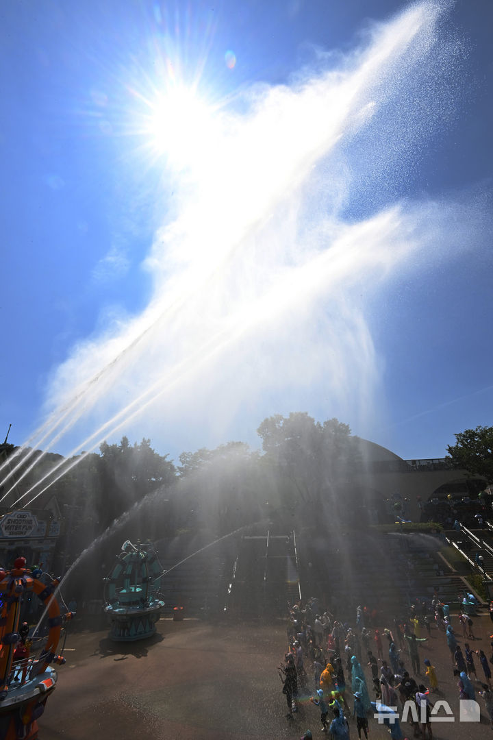 [용인=뉴시스] 김종택 기자 = 전국 대부분 지역에 폭염특보가 발효된 10일 경기 용인시 에버랜드 카니발 광장을 찾은 시민들이 여름축제 '슈팅 워터펀 시즌2'에서 물줄기를 맞으며 더위를 식히고 있다. 2025.07.10. [email protected]