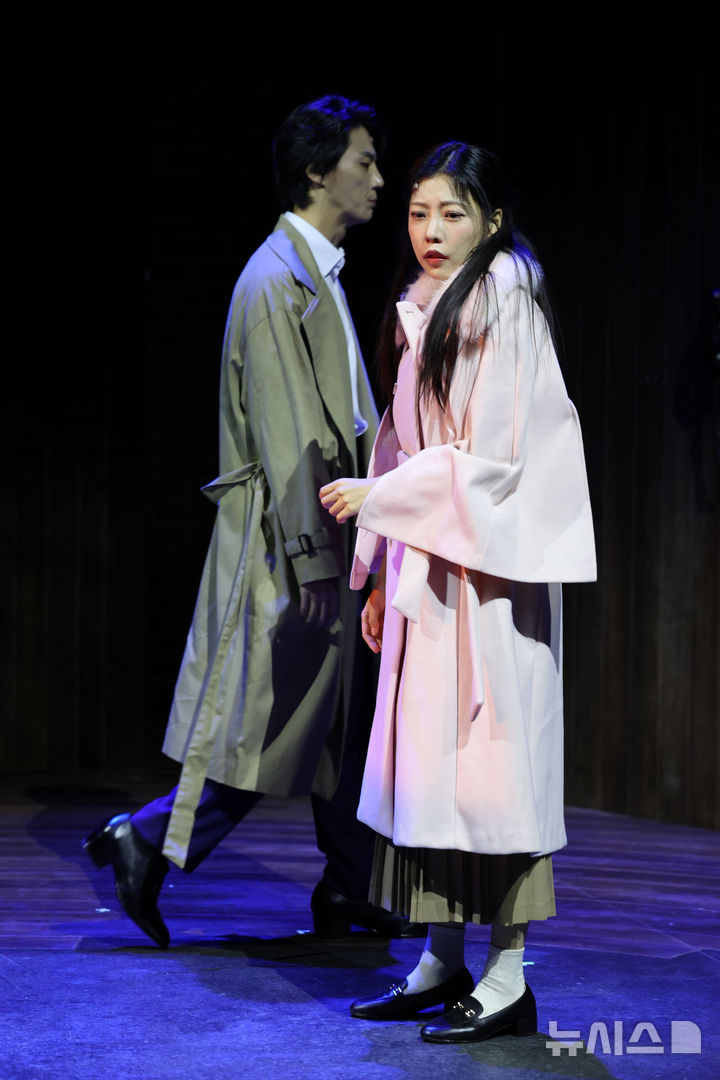 [서울=뉴시스] 박진희 기자 = 연극 '사의 찬미' 배우 서예화(윤심덕 역)와 윤시윤(김우진 역)이 10일 서울 강서구 LG아트센터 U+스테이지에서 주요 장면을 시연하고 있다. 2025.07.10 [email protected]