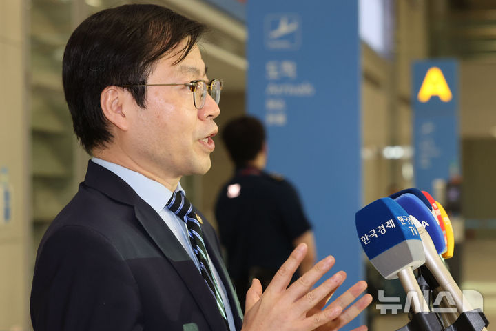 [인천공항=뉴시스] 권창회 기자 = 미국 트럼프 행정부와 통상 협상을 위해 출국했던 여한구 산업통상자원부 통상교섭본부장이 10일 인천국제공항 제2터미널을 통해 귀국해 취재진 질의에 답하고 있다. 2025.07.10. [email protected]
