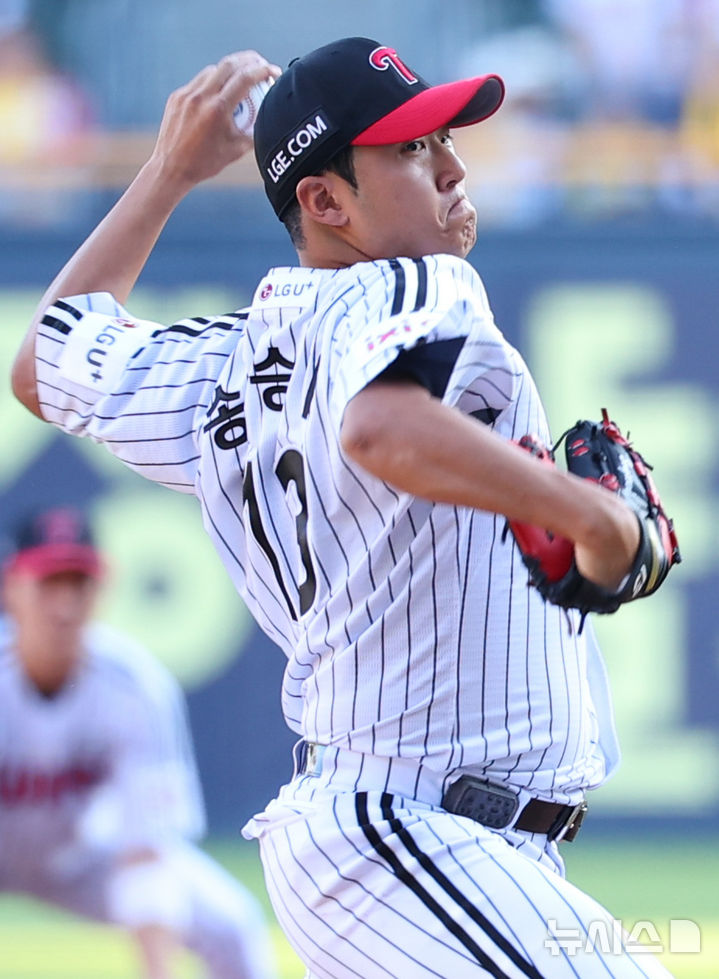 [서울=뉴시스] 최진석 기자 = 10일 서울 송파구 잠실야구장에서 열린 2025 KBO리그 키움 히어로즈와 LG 트윈스의 경기. 1회초 LG 선발 송승기가 역투하고 있다. 2025.07.10. [email protected]