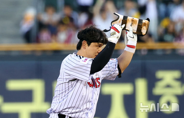 [서울=뉴시스] 최진석 기자 = 10일 서울 송파구 잠실야구장에서 열린 2025 KBO리그 키움 히어로즈와 LG 트윈스의 경기. 4회말 무사 주자없는 상황 LG 박동원이 안타를 치고 2루에서 기뻐하고 있다. 2025.07.10. [email protected]