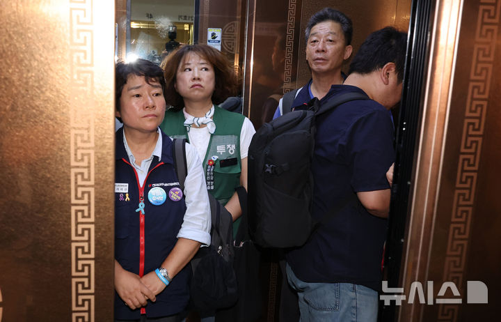 [세종=뉴시스] 강종민 기자 = 10일 밤 세종시 정부세종청사에서 이미선 민주노총 부위원장 등 민주노총 추천 근로자위원들이 공익위원이 제시한 심의촉진구간에 반발, 집단 퇴장하고 있다. 2024.07.10. [email protected]