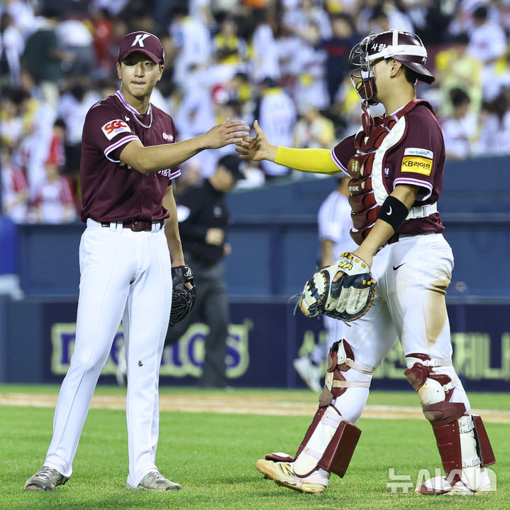 [서울=뉴시스] 최진석 기자 = 10일 서울 송파구 잠실야구장에서 열린 2025 KBO리그 키움 히어로즈와 LG 트윈스의 경기에서 4-3승리를 지킨 키움 투수 주승우가 포수 김건희와 기뻐하고 있다. 2025.07.10. [email protected]