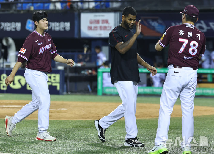 [서울=뉴시스] 최진석 기자 = 10일 서울 송파구 잠실야구장에서 열린 2025 KBO리그 키움 히어로즈와 LG 트윈스의 경기에서 4-3 승리를 따낸 키움 홍원이 감독이 선수들과 승리를 자축하고 있다. 2025.07.10. [email protected]