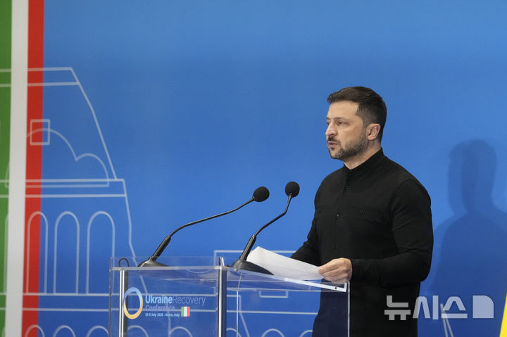 [로마=AP/뉴시스] 볼로디미르 젤렌스키 우크라이나 대통령이 10일(현지 시간) 이탈리아 로마의 라 누볼라 컨벤션 센터에서 열린 우크라이나 재건 회의(URC)에서 기자회견하고 있다. 유럽 각국 지도자들이 러시아의 공세가 계속되는 가운데서도 민간 기업과 투자자들에게 우크라이나 재건에 지금 투자할 것을 촉구했다. 이들은 회의에서 새로운 주식형 기금과 민·관 파트너십 발표를 통해, 미국의 방위 공약에 대한 불확실성 속에서도 우크라이나 지원 의지를 분명히 했다. 2025.07.11.