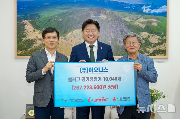 [제주=뉴시스] 경기 부천시에 본사를 둔 이오니스가 11일 오전 제주도청 도지사 집무실에서 제주지역 취약계층을 위해 공기청정기를 기부하고 있다. 왼쪽부터 강지언 제주사회복지공동모금회장, 오영훈 제주도지사, 장석운 이오니스 대표. (사진=제주도 제공) 2025.07.11. [email protected]
