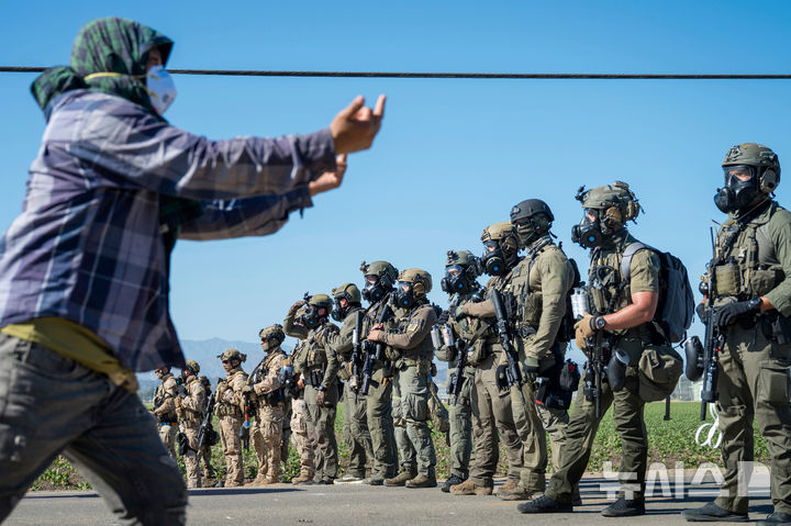 [캐머릴로=AP/뉴시스] 10일(현지 시간) 미 캘리포니아주 캐머릴로의 '글라스하우스' 대마 농장에서 이민 단속이 벌어진 가운데, 한 시위자가 단속 요원들을 향해 손가락 욕을 날리고 있다. 이번 단속에는 이민세관단속국(ICE) 요원들과 군용 차량을 동원한 주 방위군이 동원됐으며, 이에 항의하는 이민자 권리 옹호 활동가들이 현장에서 단속반과 대치했다. 2025.07.11.