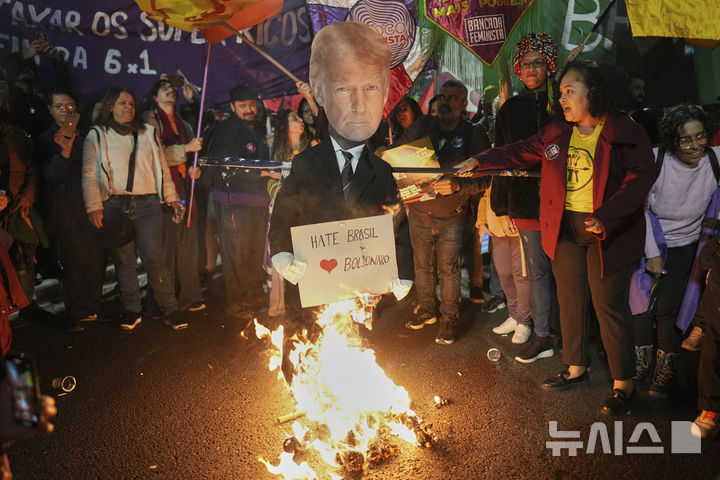 [상파울루=AP/뉴시스] 10일(현지 시간) 브라질 상파울루에서 시위대가 도널드 트럼프 미국 대통령의 인형을 불태우고 있다. 시위대는 트럼프 대통령이 브라질산 제품에 대해 50% 관세를 결정한 것에 분노해 시위를 벌였다. 2025.07.11.