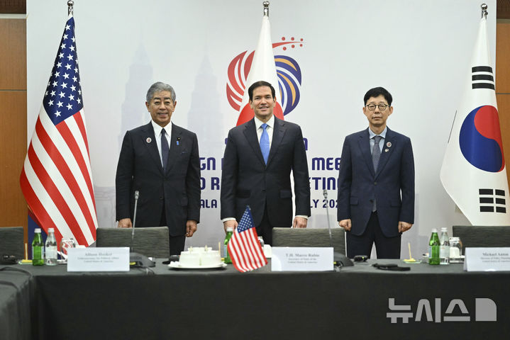 [쿠알라룸푸르=AP/뉴시스] 박윤주(오른쪽) 외교부 1차관이 11일(현지 시간) 말레이시아 쿠알라룸푸르 컨벤션센터에서 동남아국가연합(ASEAN, 아세안) 외교장관회의를 계기로 열린 한미일 외교장관회의에 참석해 이와야 다케시(왼쪽) 일본 외무상, 마코 루비오 미국 국무장관과 기념 촬영을 하고 있다. 2025.07.11.