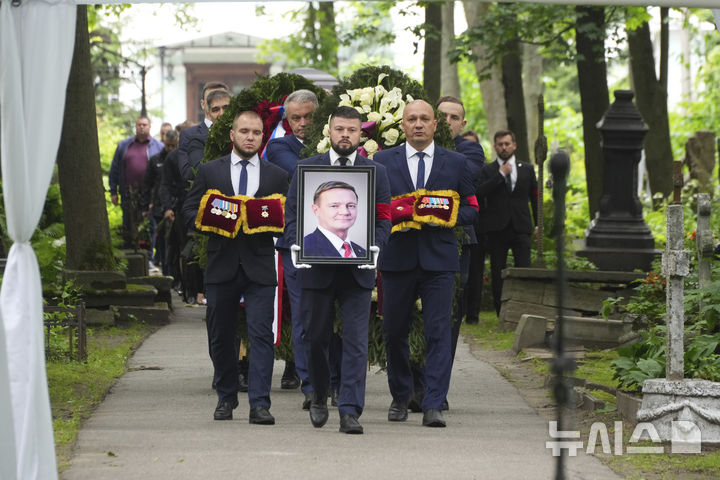 [상트페테르부르크=AP/뉴시스] 11일(현지 시간) 러시아 상트페테르부르크의 스몰렌스크 묘지에서 로만 스타로보이트 전 교통부 장관의 장례식이 열려 관계자들이 고인의 영정과 관을 운구하고 있다. 스타로보이트는 지난 7일 블라디미르 푸틴 대통령에게 해임된 후 숨진 채 발견됐으며 당국은 그가 스스로 목숨을 끊은 것으로 추정하고 있다. 2025.07.11.