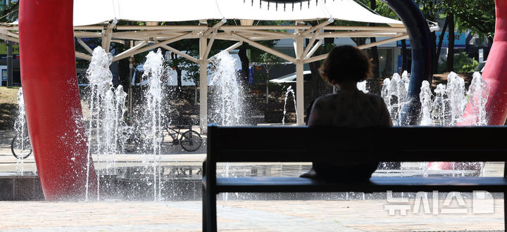 [인천=뉴시스] 전진환 기자 = 연일 폭염이 이어지는 11일 인천 남동구 중앙공원에서 한 시민이 분수대에서 나오는 물줄기를 보며 더위를 식히고 있다. 2025.07.11. [email protected]
