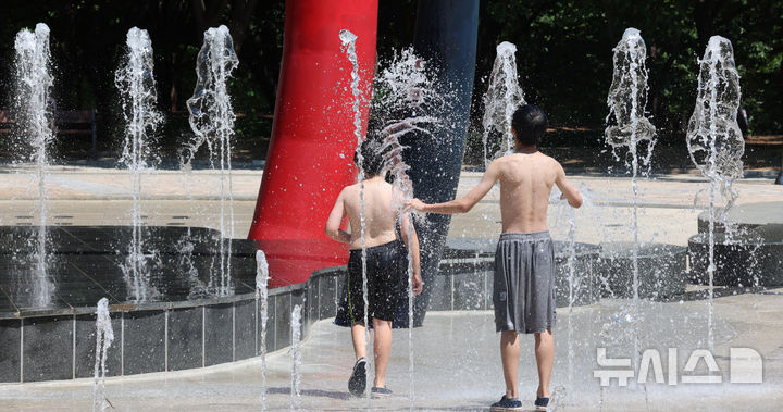 [인천=뉴시스] 전진환 기자 = 연일 폭염이 이어지는 11일 인천 남동구 중앙공원 분수대에서 어린이들이 웃옷을 벗고 물줄기를 맞으며 더위를 식히고 있다. 2025.07.11. [email protected]