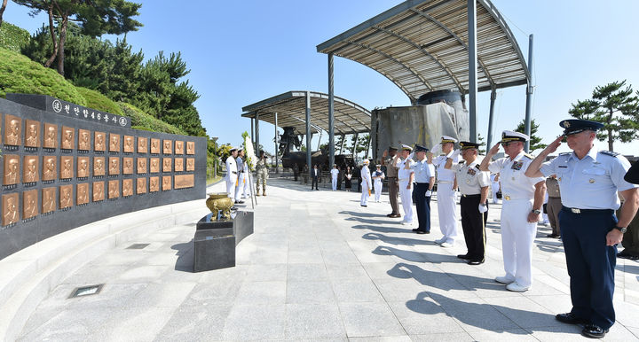 [서울=뉴시스] 이영환 기자 = 김명수 합참의장, 댄 케인 미 합참의장, 요시다 요시히데 일본 통합막료장 등이 11일 25년 한미일 합참의장 회의 종료 후 경기 평택시 해군2함대사령부 천안함 추모비에서 전사자에 대한 경례를 하고 있다. (사진=합참 제공) 2025.07.11. [email protected] *재판매 및 DB 금지