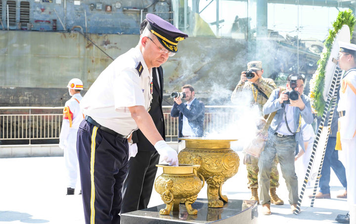 [서울=뉴시스] 이영환 기자 = 요시다 요시히데 일본 통합막료장이 11일 25년 한미일 합참의장 회의 종료 후 경기 평택시 해군2함대사령부를 방문해 천안함 추모비에서 헌화 및 분향을 하고 있다. (사진=합참 제공) 2025.07.11. [email protected] *재판매 및 DB 금지