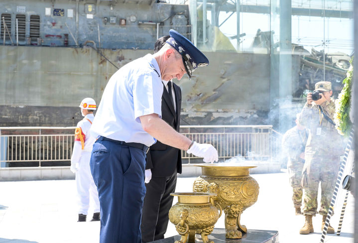 [서울=뉴시스] 이영환 기자 = 댄 케인 미 합참의장이 11일 25년 한미일 합참의장 회의 종료 후 경기 평택시 해군2함대사령부를 방문해 천안함 추모비에서 헌화 및 분향을 하고 있다. (사진=합참 제공) 2025.07.11. [email protected] *재판매 및 DB 금지