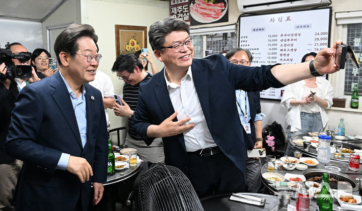 [서울=뉴시스] 최동준 기자 = 이재명 대통령이 11일 서울 종로구 한 식당에서 시민과 기념사진을 찍고 있다.