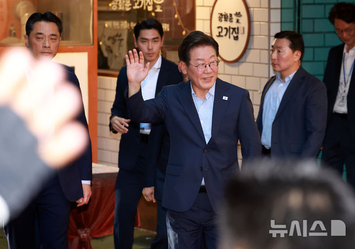 [서울=뉴시스] 이영환 기자 = 이재명 대통령이 11일 서울 종로구 광화문의 한 식당에서 식사를 마친 후 시민들에게 손인사를 하고 있다.
