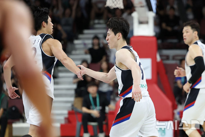 [안양=뉴시스] 조성우 기자 = 11일 오후 안양 동안구 정관장 아레나에서 열린 2025 남자농구 국가대표 평가전 대한민국과 일본의 경기, 한국 이정현이 득점한 뒤 여준석과 하이파이브 하고 있다. 2025.07.11. [email protected]