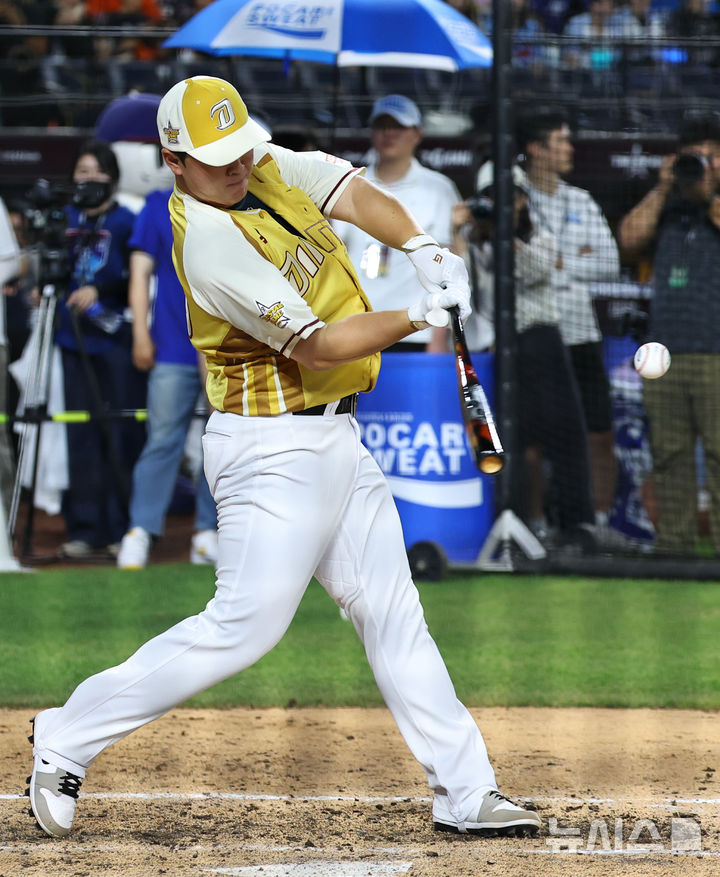 [대전=뉴시스] 최진석 기자 = 11일 대전 중구 대전한화생명볼파크에서 열린 2025 KBO리그 올스타 프라이데이 홈런더비 예선에서 NC 김형준이 타격하고 있다. 2025.07.11. [email protected]