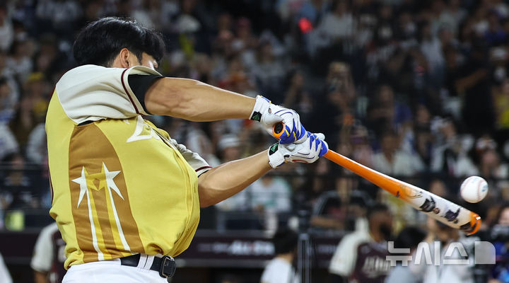 [대전=뉴시스] 최진석 기자 = 11일 대전 중구 대전한화생명볼파크에서 열린 2025 KBO리그 올스타 프라이데이 홈런더비 예선에서 한화 문현빈이 타격하고 있다. 2025.07.11. [email protected]