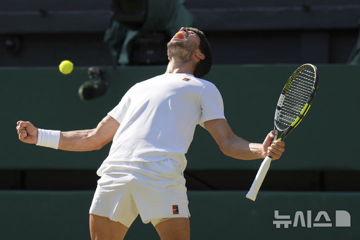 [런던=AP/뉴시스] 카를로스 알카라스(2위·스페인)가 11일(현지 시간) 영국 런던 올잉글랜드 클럽에서 열린 2025 윔블던 테니스 대회 남자 단식 준결승에서 테일러 프리츠(5위·미국)를 3-1(6-4 5-7 6-3 7-6)로 꺾은 뒤 포효하고 있다. 3연패를 노리는 알카라스는 결승에서 얀니크 신네르(1위·이탈리아)와 우승을 다툰다. 2025.07.12.