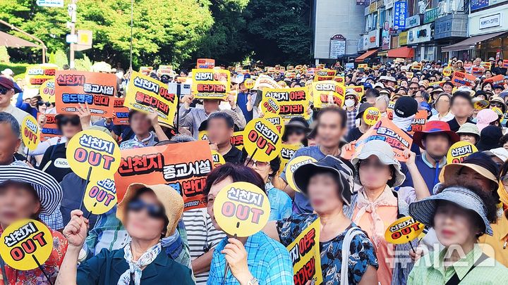 [과천=뉴시스] 박종대 기자 = 12일 오후 과천중앙공원에서 열린 '신천지 예배시설 용도변경 반대 집회'에서 시민들이 '신천지 OUT', '종교시설 용도변경 반대' 등의 문구가 적힌 피켓과 손팻말을 들고 구호를 외치고 있다. 이날 집회에는 약 1000여 명이 참석해 신천지의 대형마트 건물 예배당 추진에 반대 의사를 밝혔다. 2025.07.12. [email protected]