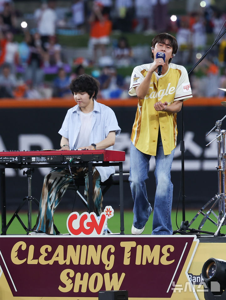 [대전=뉴시스] 최진석 기자 = 12일 대전 중구 대전한화생명볼파크에서 열린 2025 KBO리그 올스타전 드림 올스타와 나눔 올스타의 경기 크리닝 타임쇼에서 가수 이무진이 공연을 하고 있다. 2025.07.12. [email protected]