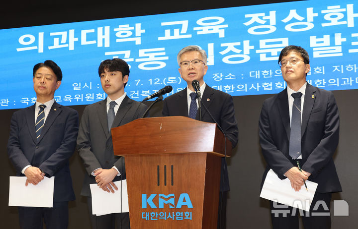 [서울=뉴시스] 권창회 기자 = 김택우 대한의사협회장이 12일 오후 서울 용산구 대한의사협회에서 의과대학 교육 정상화를 위한 공동 성명서를 발표하고 있다. 2025.07.12. [email protected]