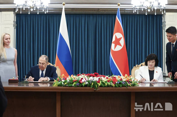 [원산=AP/뉴시스] 러시아 외무부가 제공한 사진에 세르게이 라브로프(왼쪽) 러시아 외무장관과 최선희 북한 외무상이 12일 북한 원산에서 '제2차 전략대화'를 마친 후 2026-27 교류 계획서에 서명하고 있다. 2025.07.13.