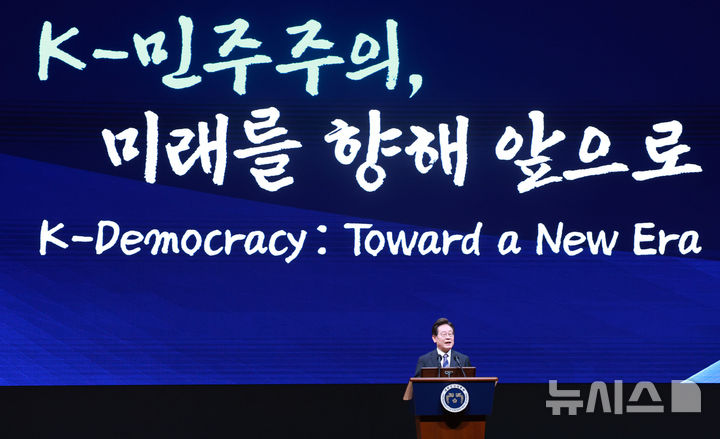 [서울=뉴시스] 고범준 기자 = 이재명 대통령이 13일 서울 강남구 코엑스에서 열린 2025 세계정치학회(IPSA) 서울총회 개막식에서 기조연설을 하고 있다. 2025.07.13. [email protected]