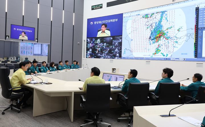 [서울=뉴시스] 황준선 기자 = 김민재 행정안전부장관 직무대행이 13일 밤 정부세종청사 중앙재난안전상황실에서 전라·경상권 호우대처상황 점검회의를 주재하고 있다. (사진=행정안전부 제공) 2025.07.13. [email protected] *재판매 및 DB 금지