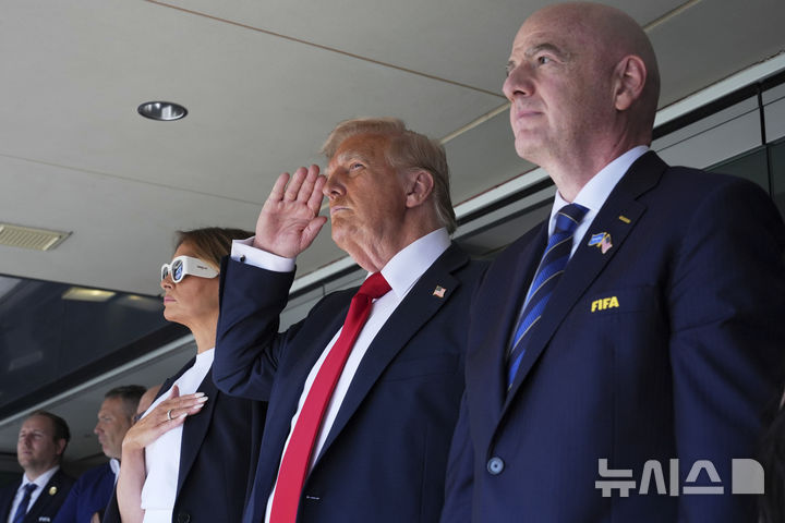 [이스트 러더퍼드=AP/뉴시스] 도널드 트럼프(가운데) 미국 대통령이 부인 멜라니아(왼쪽) 여사, 잔니 인판티노 국제축구연맹(FIFA) 회장과 함께 13일(현지 시간) 뉴저지주 이스트 러더퍼드의 메트라이프 스타디움에서 열린 2025 FIFA 클럽 월드컵 첼시(잉글랜드)와 파리 생제르맹(PSG, 프랑스)의 결승전에 참석해 국민의례를 하고 있다. 첼시가 PSG를 3-0으로 완파하고 우승컵을 들어 올렸다. 2025.07.14.