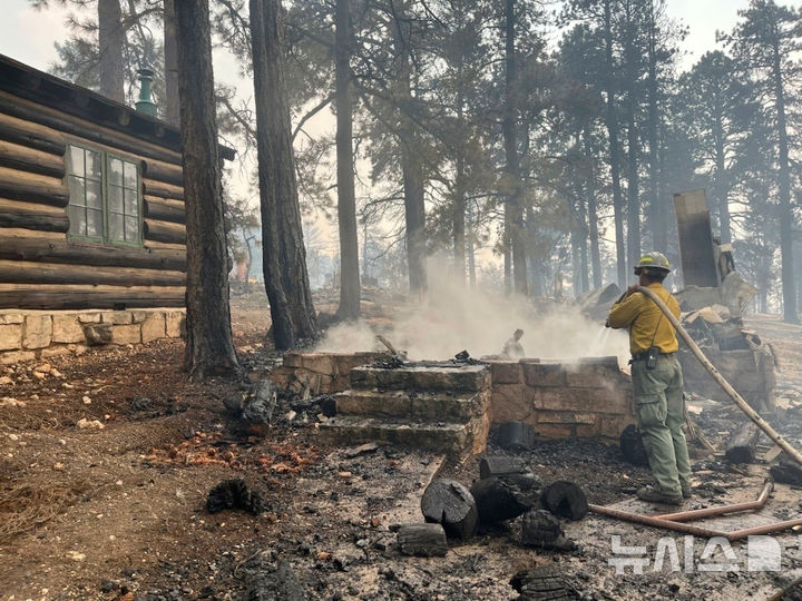 [그랜드캐니언=AP/뉴시스] 13일(현지 시간) 미 애리조나주 그랜드캐니언 국립공원 노스림 지역에서 산불이 발생해 한 소방관이 소실된 건물 잔해의 잔불을 정리하고 있다. 국립공원 관리소 측은 이 화재로 노스 림의 유서 깊은 숙소인 '그랜드캐니언 롯지'를 비롯해 방문자 센터, 주유소 등 5~80채의 시설물이 소실됐다고 전했다. 2025.07.14.