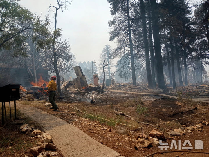 [그랜드캐니언=AP/뉴시스] 13일(현지 시간) 미 애리조나주 그랜드캐니언 국립공원 노스림 지역에서 산불이 발생해 한 소방관이 소실된 건물 잔해의 잔불을 정리하고 있다. 국립공원 관리소 측은 이 화재로 노스 림의 유서 깊은 숙소인 '그랜드캐니언 롯지'를 비롯해 방문자 센터, 주유소 등 5~80채의 시설물이 소실됐다고 전했다. 2025.07.14.