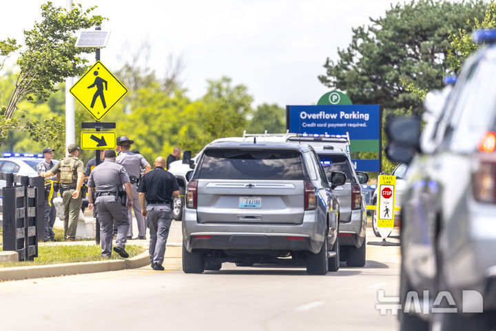 [렉싱턴=AP/뉴시스] 13일(현지 시간) 미 켄터키주 렉싱턴의 블루그래스 공항 인근 도로에서 총격이 발생해 경찰이 현장을 조사하고 있다. 이날 한 차량 운전자가 교통 단속 중이던 경찰관에게 총을 쏜 뒤 차량을 탈취해 인근 리치먼드 로드 침례교회로 도주했으며, 이후 예배 중이던 신도들에게 총격을 가해 여성 2명이 숨지고 2명이 부상했다. 최초 총격을 받은 경관은 병원으로 옮겨졌으며 총격 용의자는 현장에서 경찰에 의해 사살됐다. 2025.07.14.