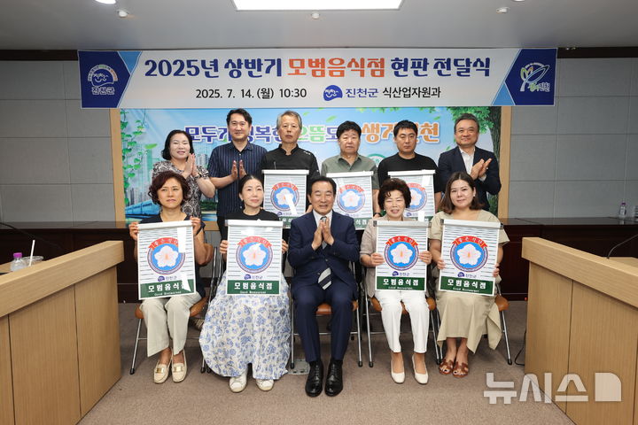 [진천=뉴시스] 송기섭(아랫줄 왼쪽 세 번째) 충북 진천군수가 2025년 상반기 모범음식점 업주들과 14일 군청에서 현판 전달식을 마친 뒤 기념촬영을 하고 있다. 신규 지정된 11개 업소에는 상하수도요금 감면, 위생용품 지원 등이 이뤄진다. (사진=진천군 제공) 2025.07.14. [email protected]