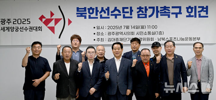 [광주=뉴시스] 김혜인 기자 = 14일 오전 광주 서구 광주시의회 시민소통실 1층에서 김대중재단기후환경위원회·남북스포츠나눔운동본부가 주최하는 '광주 2025 세계양궁선수권 대회 북한선수단 참가촉구 회견'이 열리고 있다. 2025.07.14. [email protected]