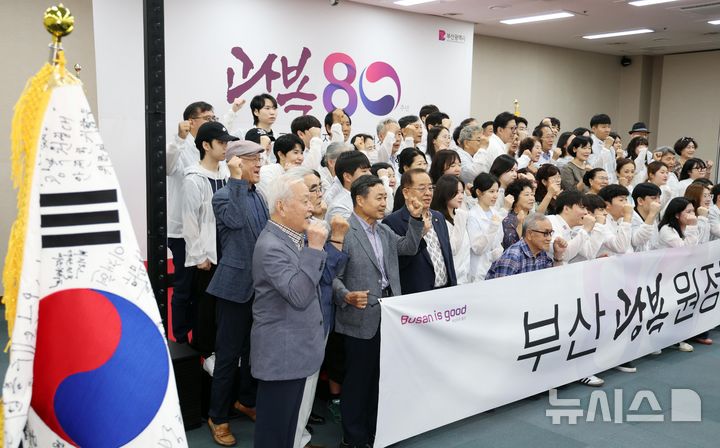 [부산=뉴시스] 하경민 기자 = 광복 제80주년 앞두고 14일 부산 연제구 부산시의회 대회의실에서 독립유공자 후손과 역사 교사 및 대학생 등 80명으로 구성된 '2025 부산광복원정대'가 출정식을 갖고 있다.