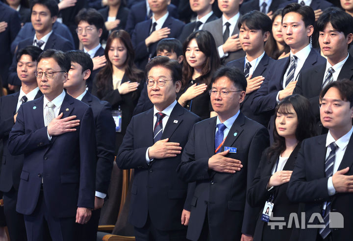 [진천=뉴시스] 최동준 기자 = 이재명 대통령이 14일 충북 진천 국가공무원인재개발원에서 5급 신임관리자과정 교육생에게 특강에 앞서 참석자들과 국민의례를 하고 있다. (대통령실통신사진기자단) 2025.07.14. [email protected]