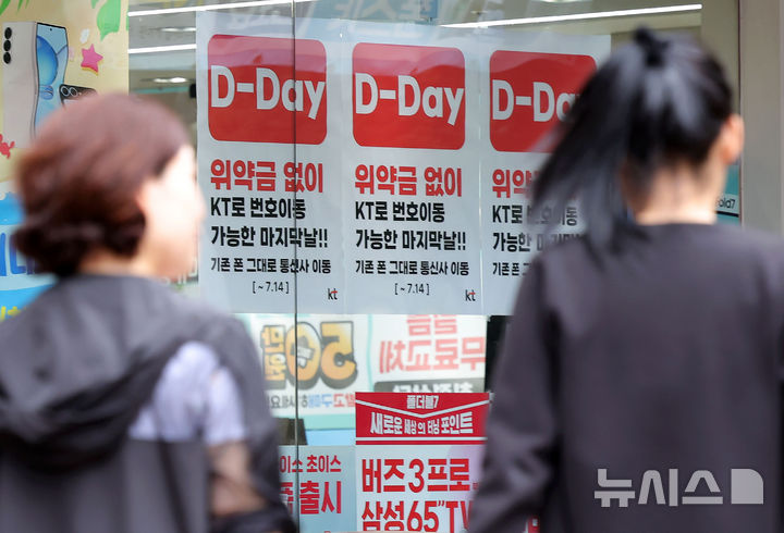 [서울=뉴시스] 홍효식 기자 = SK텔레콤의 위약금 면제 마감 시한이 종료되는 14일 서울 시내 한 KT 매장에 위약금 면제 관련 안내문이 부착되어 있다. 2025.07.14. [email protected]