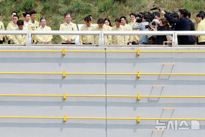 [청주=뉴시스] 고범준 기자 =이재명 대통령이 14일 충북 청주시 흥덕구 오송읍 궁평2지하차도를 방문해 희생자 추모 묵념을 하고 있다.