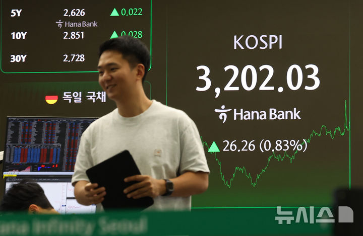 [서울=뉴시스] 최진석 기자 = 코스피가 전 거래일보다 0.83% 오른 3202.03 마감한 14일 서울 하나은행 본점 딜링룸 모니터에 종가가 표시돼 있다. 이날 기록한 3202.03은 종가 기준 연중 최고다. 2025.07.14. [email protected]
