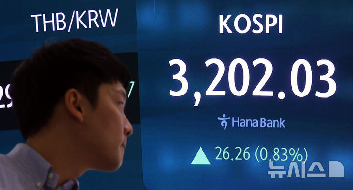 [서울=뉴시스] 최진석 기자 = 코스피가 전 거래일보다 0.83% 오른 3202.03 마감한 14일 서울 하나은행 본점 딜링룸 모니터에 종가가 표시돼 있다. 이날 기록한 3202.03은 종가 기준 연중 최고다. 2025.07.14. [email protected]